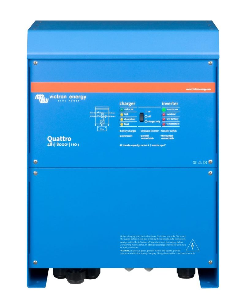 Victron Quattro 48/8000/110-100/100 on 8000 VA invertteri‑laturi kahdella AC‑tulolla ja 110 A latauksella suuren mittakaavan 48 V järjestelmiin.